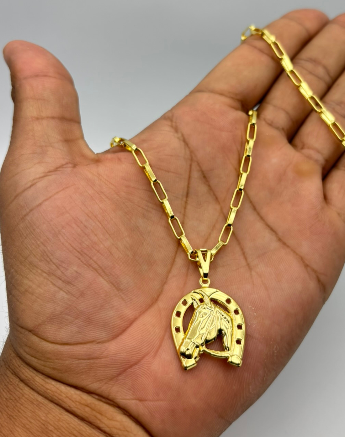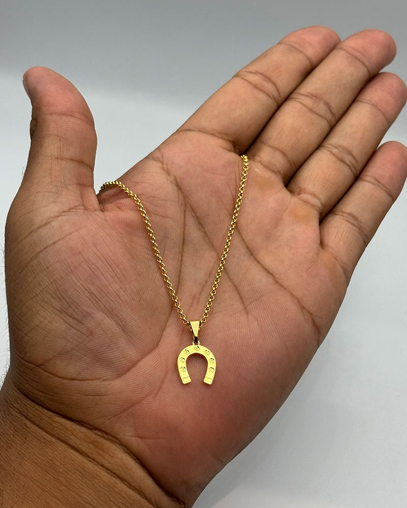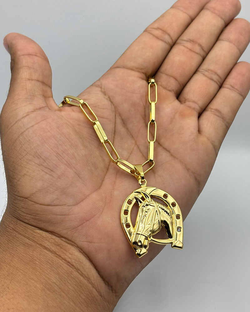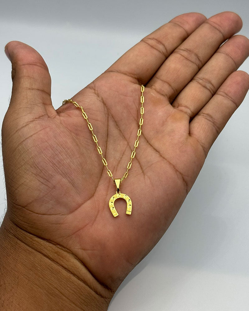 CORRENTE TIJOLINHO LONG 5MM (FECHO GAVETA) + PINGENTE FERRADURA GRANDE (BANHADO A OURO 18K)