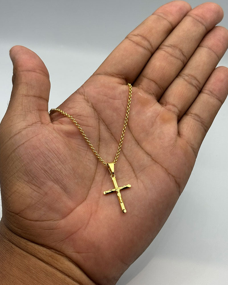 CORRENTE TIJOLINHO DE QUINA 2MM - 70CM + PINGENTE CRUZ PONTEADA COM CRISTO (BANHADO A OURO 18K)