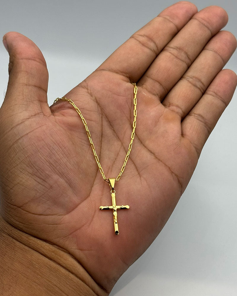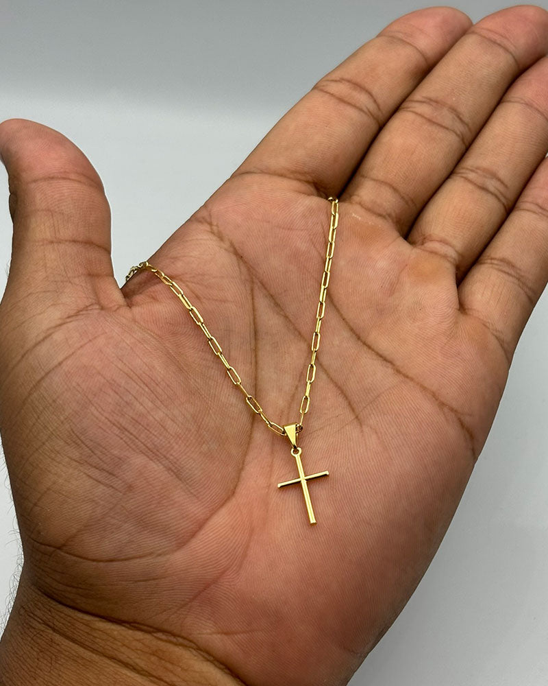 CORRENTE TIJOLINHO DE QUINA 2MM - 70CM + PINGENTE CRUZ PALITO PEQUENA - 2,5CM (BANHADO A OURO 18K)